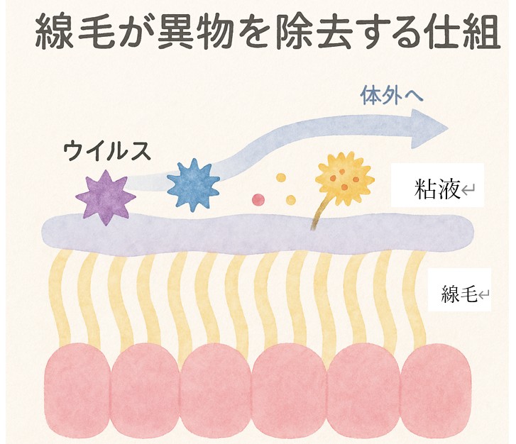 - 線毛(せんもう)と呼ばれる小さな毛が、異物を体の外へ運ぶ