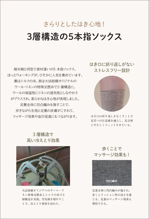 - 表面にはオリジナルウール・リネン特殊交撚糸、裏面はシルク使用の3層構造で暖かくさっぱりした履き心地と高い冷えとり効果。