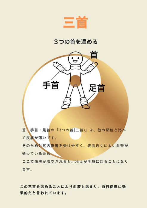冷えとり健康法では、前首の付け根の部分は五臓(肝・心・脾・肺・腎)の毒が出る場所とされこの部分に絹・綿を重ねる毒出しが促進されるとのことです。