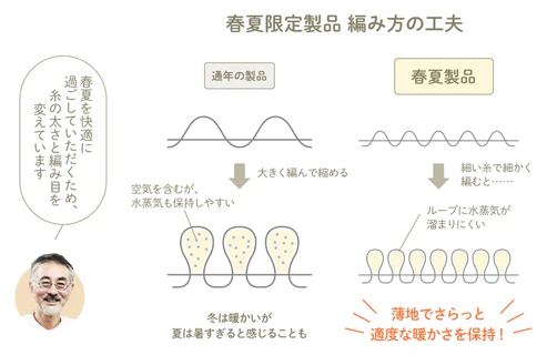空気層が多く含まれ、軽くて温かく爽やかな装着感です。他の製品を開発中にたまたま私がデータを間違えてトンネルの様な空気層ができてしまいました。これを活かしてレッグウォーマーを作ったところ、とても気持ちのいいものができましたので販売させていただくことにいたしました。けがの功名ですね。(笑)